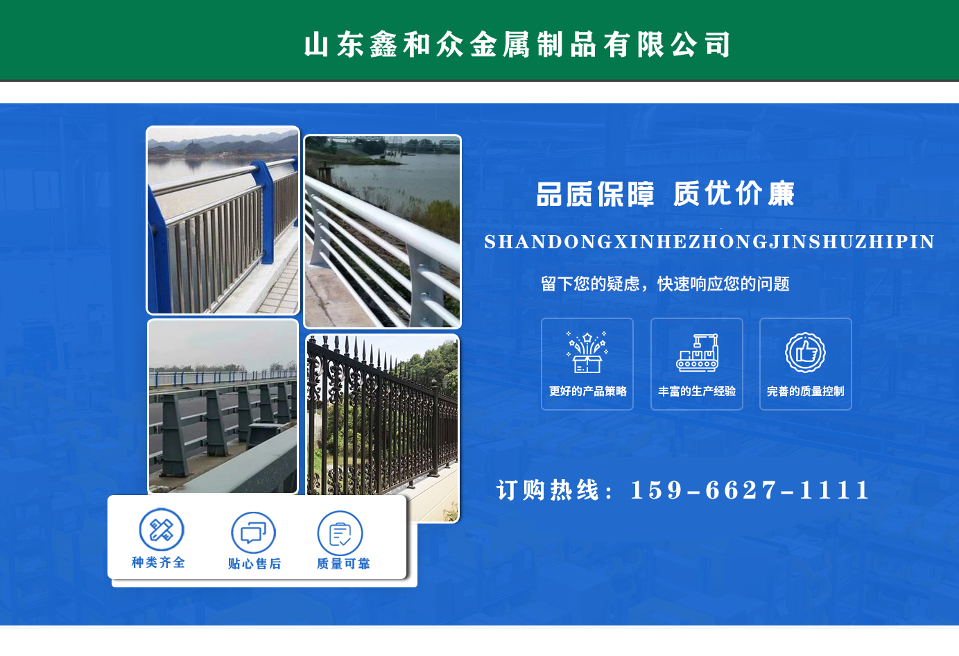 山東鑫和眾金屬制品有限公司主要產(chǎn)品有防撞護欄,橋梁護欄,道路護欄,河道護欄,不銹鋼護欄等護欄。提供設(shè)計方案,一站式定制,包您滿意價格優(yōu)惠,歡迎來電咨詢!    公司常年從事銷售護欄防撞護欄,橋梁護欄,道路護欄,河道護欄,不銹鋼護欄,橋梁鋼護欄,河道燈光護欄等。產(chǎn)品廣泛應(yīng)用于橋梁、河道、旅游景區(qū)、道路、公路、公園、小區(qū)、景觀、道路防撞等領(lǐng)域。    公司產(chǎn)品均采用優(yōu)質(zhì)不銹鋼材料,符合相關(guān)標準。各種型號不銹鋼復合管及護欄,質(zhì)量嚴格把控。產(chǎn)品強度高、耐腐蝕、焊接牢固、抗沖擊、性能好,防撞護欄結(jié)構(gòu)簡單、美觀實用大方。     歡迎前來訂購!...